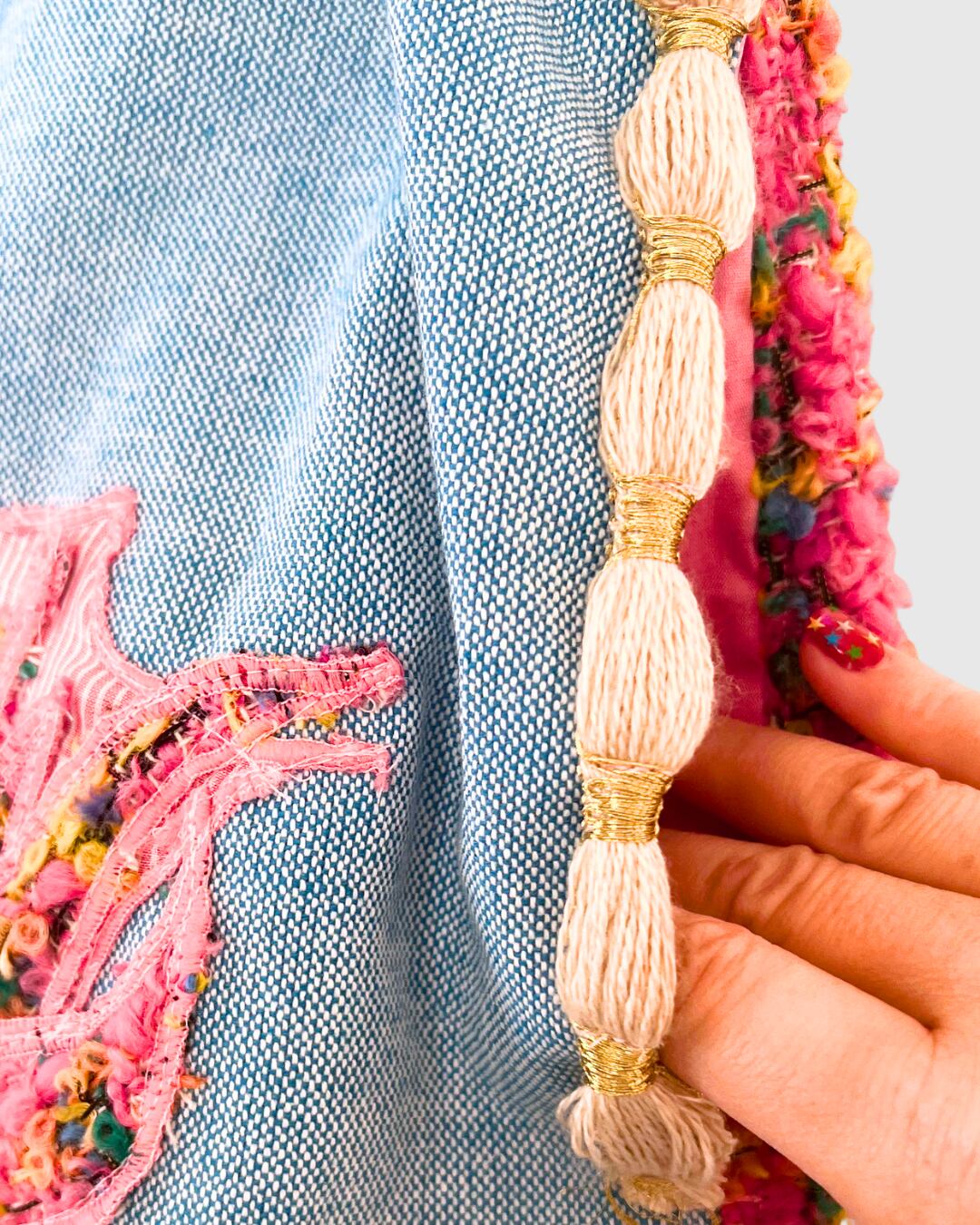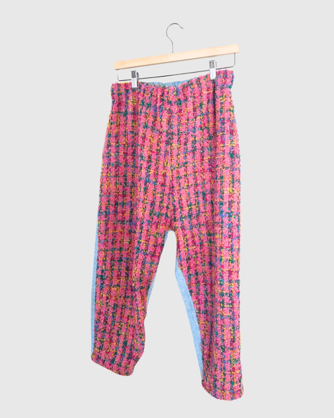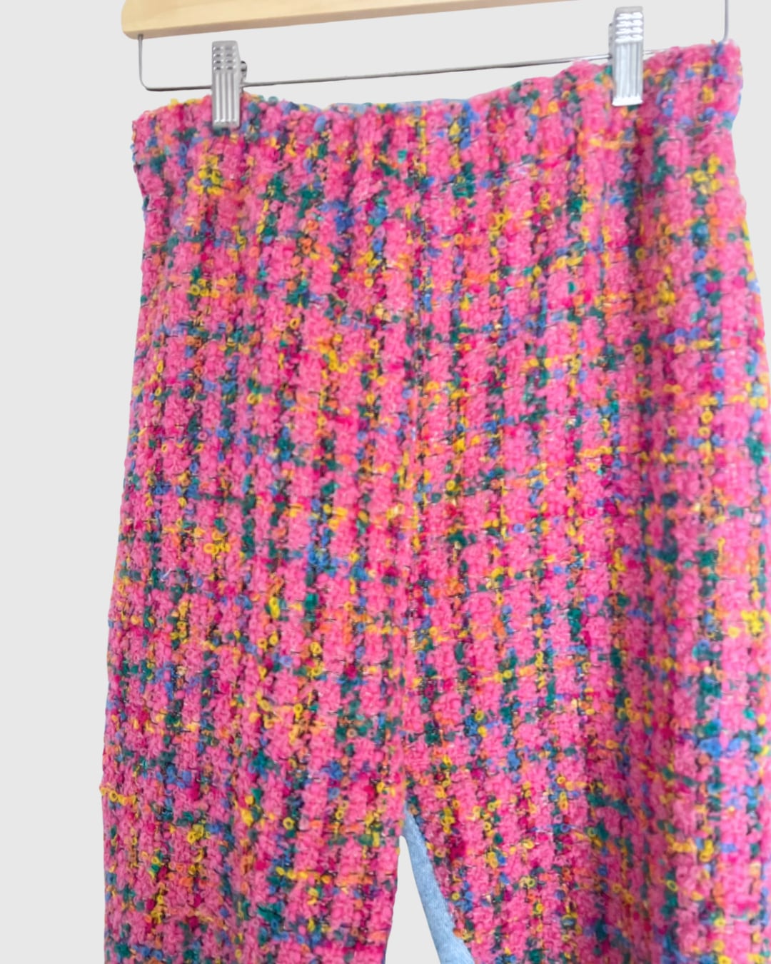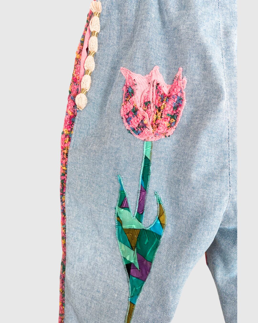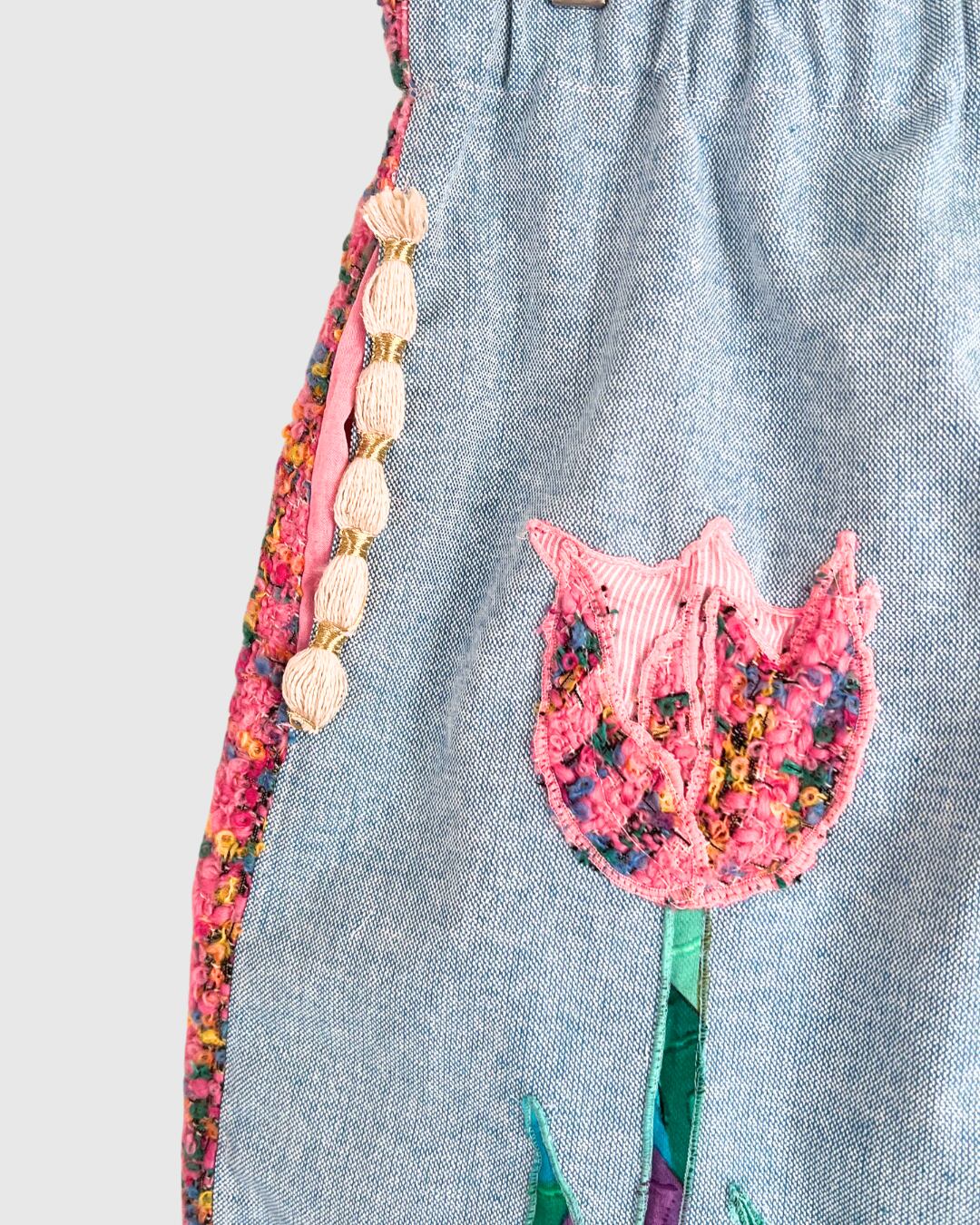 フロントはピンクのツイードでスッキリと洗練された印象を与え、バックには大きなチューリップのパッチワークで遊びごころを。股上が深いので、ウエストは少し高めにするとトップスをインしても外に出しても自由にスタイリングを楽しめます。