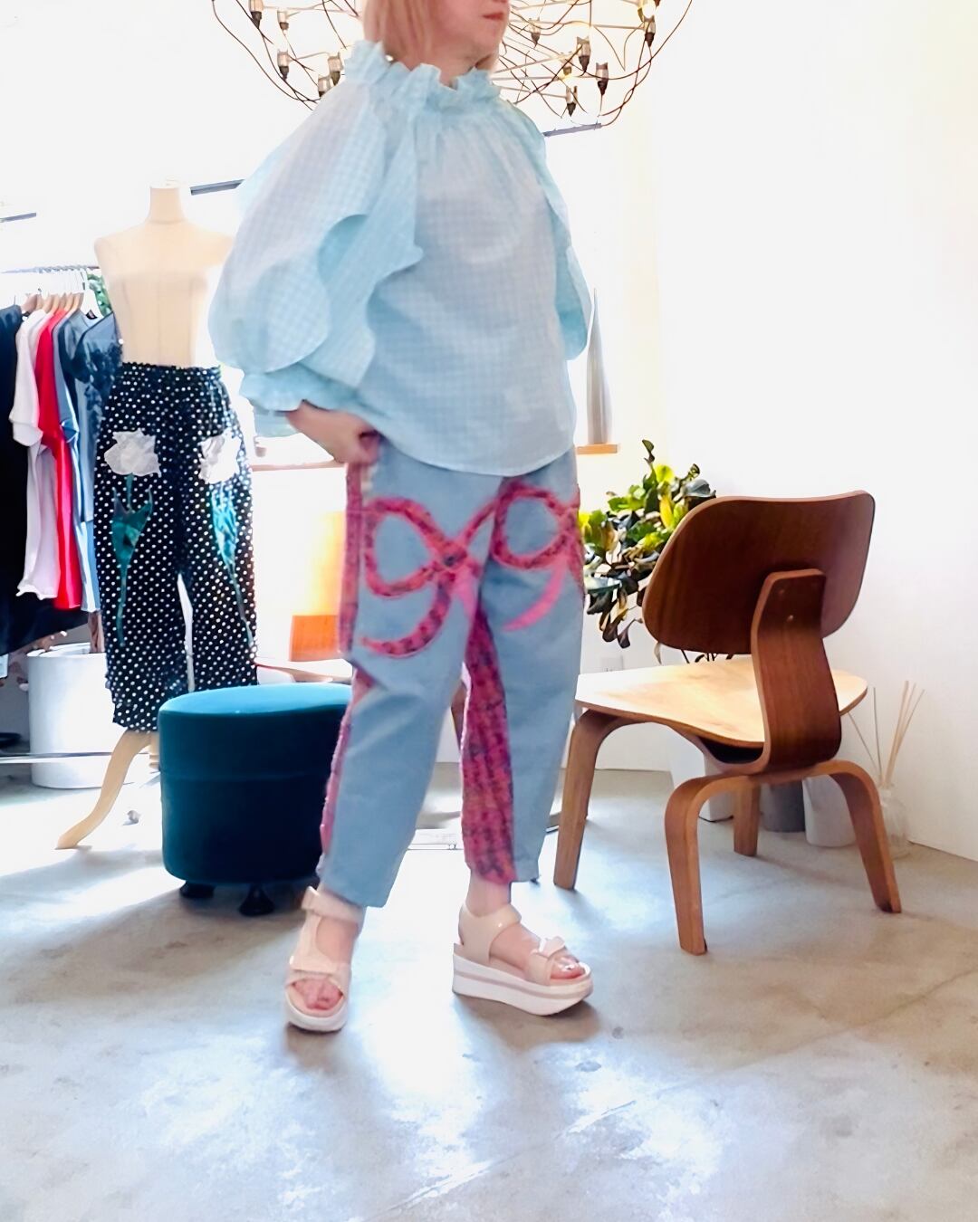 こちらはフロントにリボン。バックスタイルがピンクのツィードでお造りしました。股上が深いので、ウエストは少し高めにすルナどしてトップスをインしても外に出しても自由にスタイリングをお楽しみ頂けます。