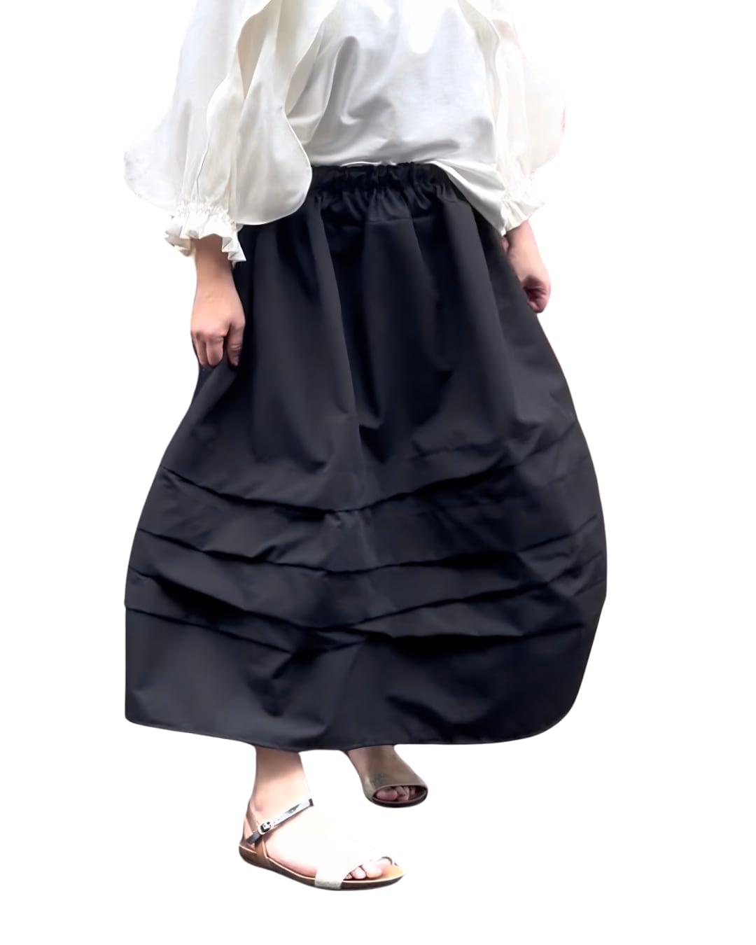 横タックの入った黒のシンプルなスカート。ギャザーがたっぷり入ったふわっとしたシルエットが特徴です。横に入ったタックがアクセントになっていてシックな白ブラウスとヒールやローハーと合わせたらクラシックなシーンにもお使いいただけます。