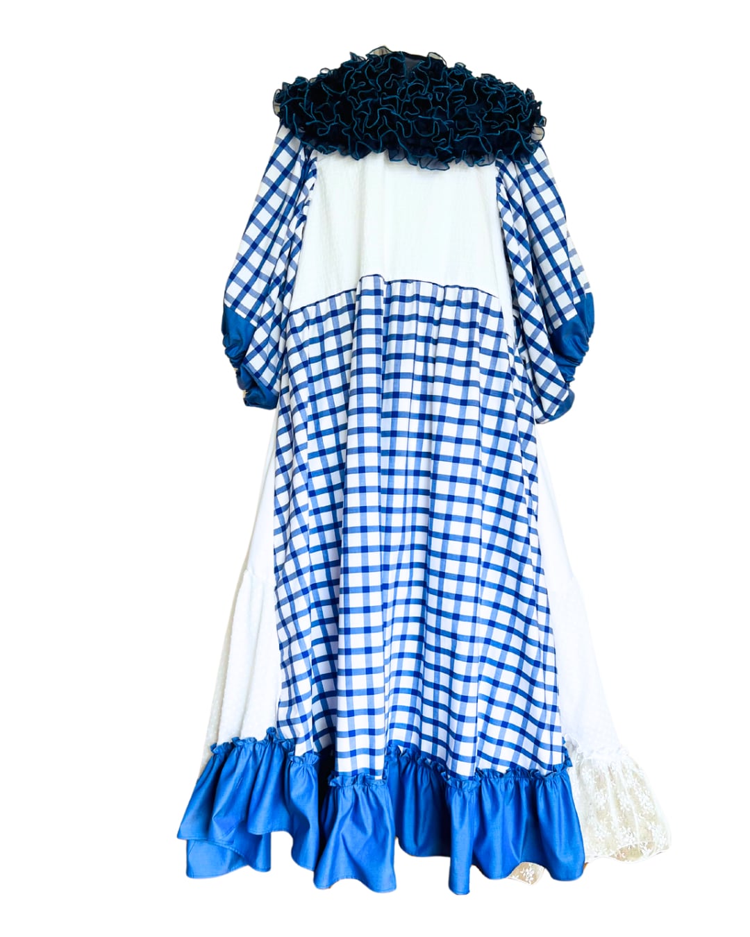 ブルーとホワイトで爽やかに。生地をたっぷりと使ってスカートがふわっと広がるワンピース。ふりふりっと仕上げました。