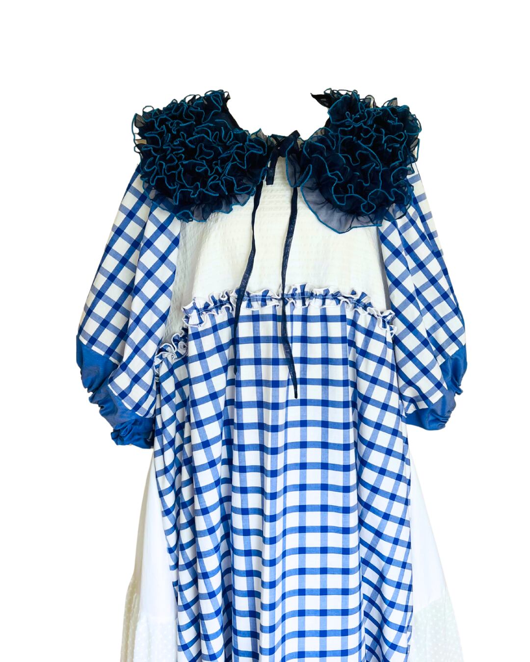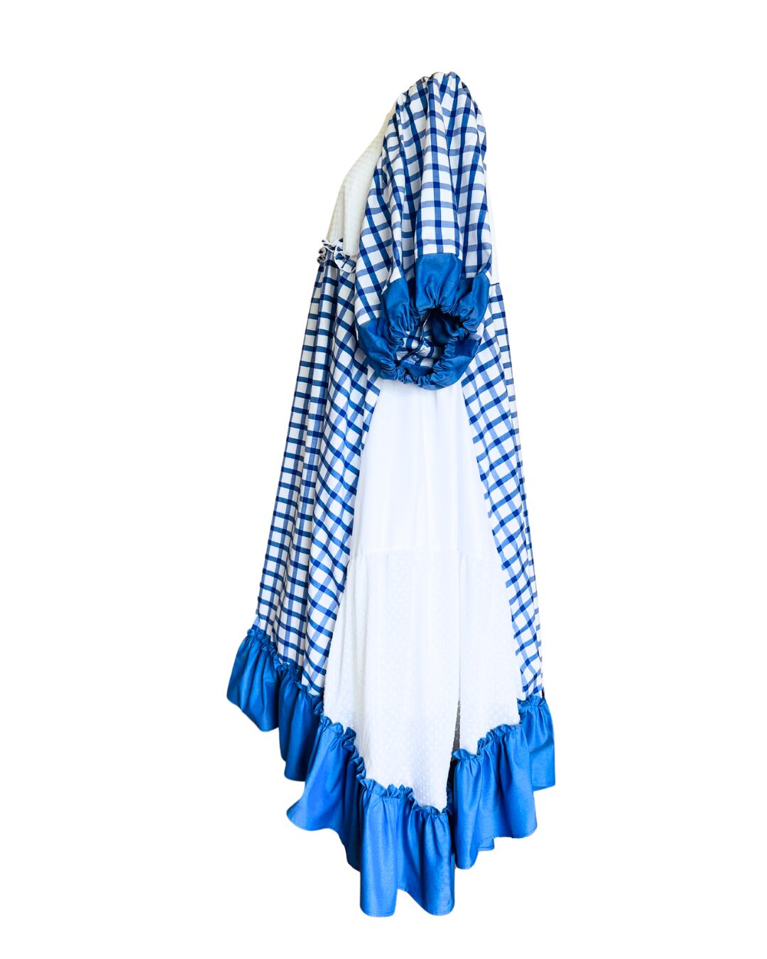 青のギンガムチェックワンピース。お袖はふわっと短めです。