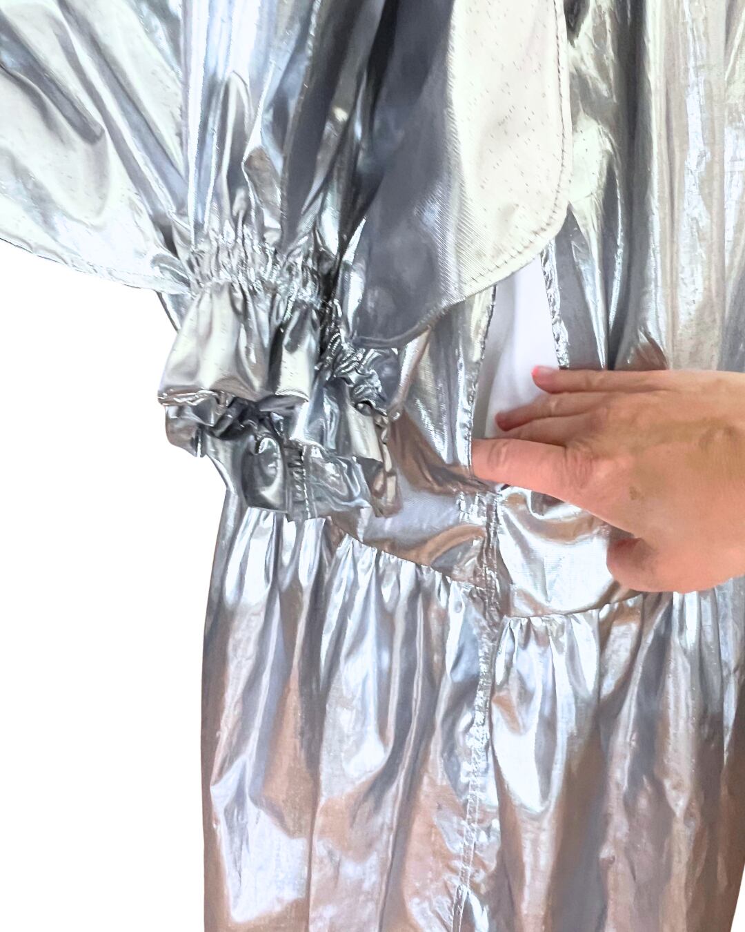 ゆったりしたシルエットのシルバーワンピース。とても軽い仕上がりです。襟はくしゅくしゅっとギャザーで、ゴムで伸び縮みします。はなびらをイメージしたお袖がポイントで丸くぽこぽこに。ふわっと大きなお袖です。ポケットは両サイド1つづつ付けました。透けるのでインナーが必要です。