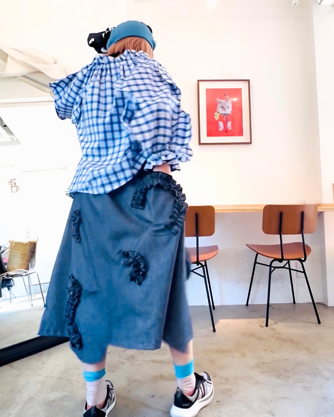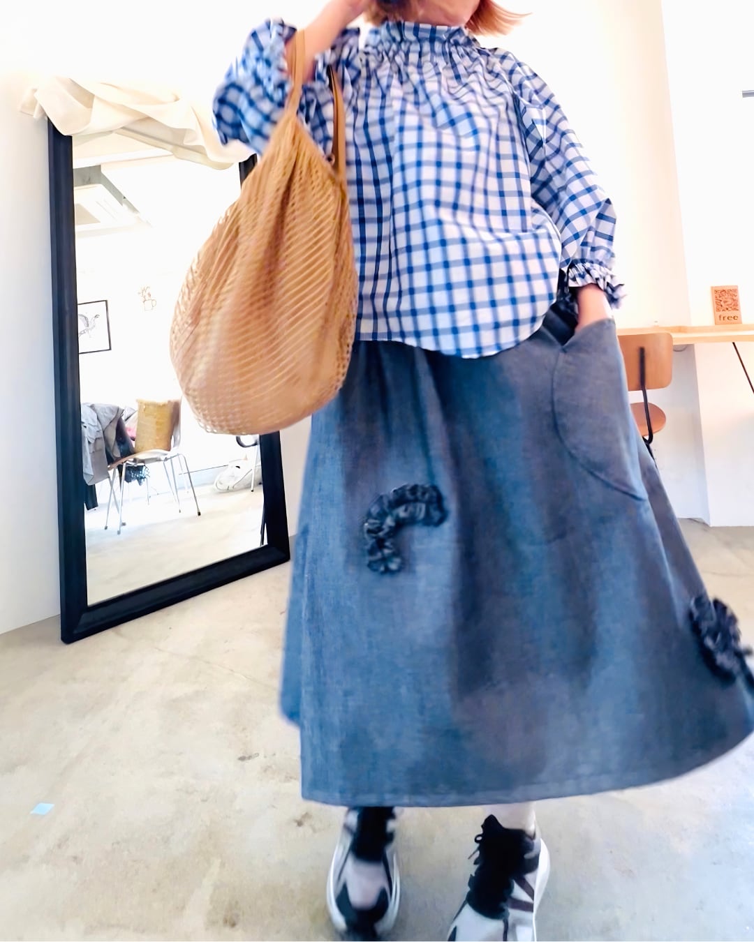 サイドに花びらのぽこぽこをがついたストレッチデニムのギャザースカート。ポケットは丸く付けました。ふりふりを付けてカジュアルに仕上げました。