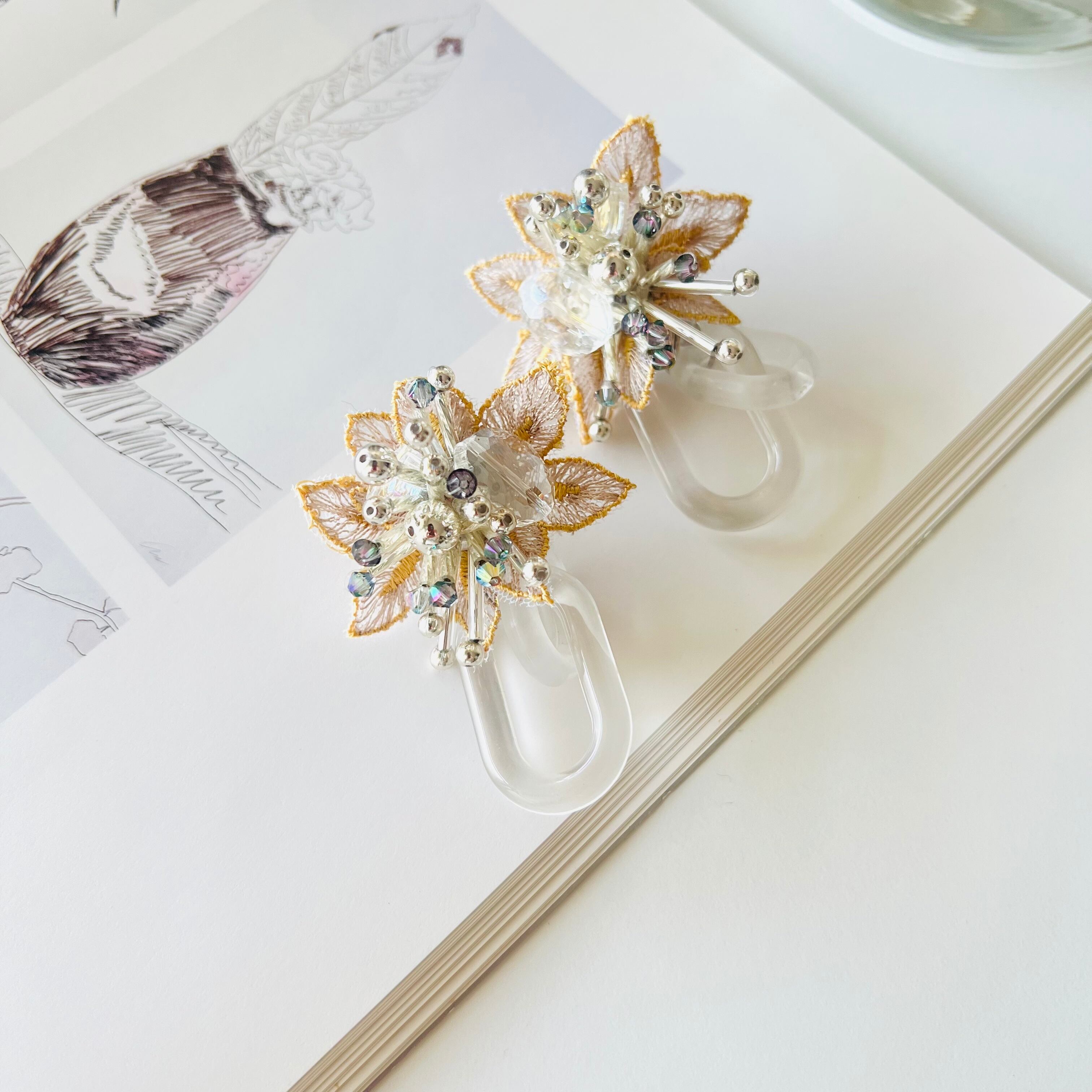 レースのお花の中心にはクリアのビジューやスワロフスキーがらすのオーロラビーズがぎっしり。