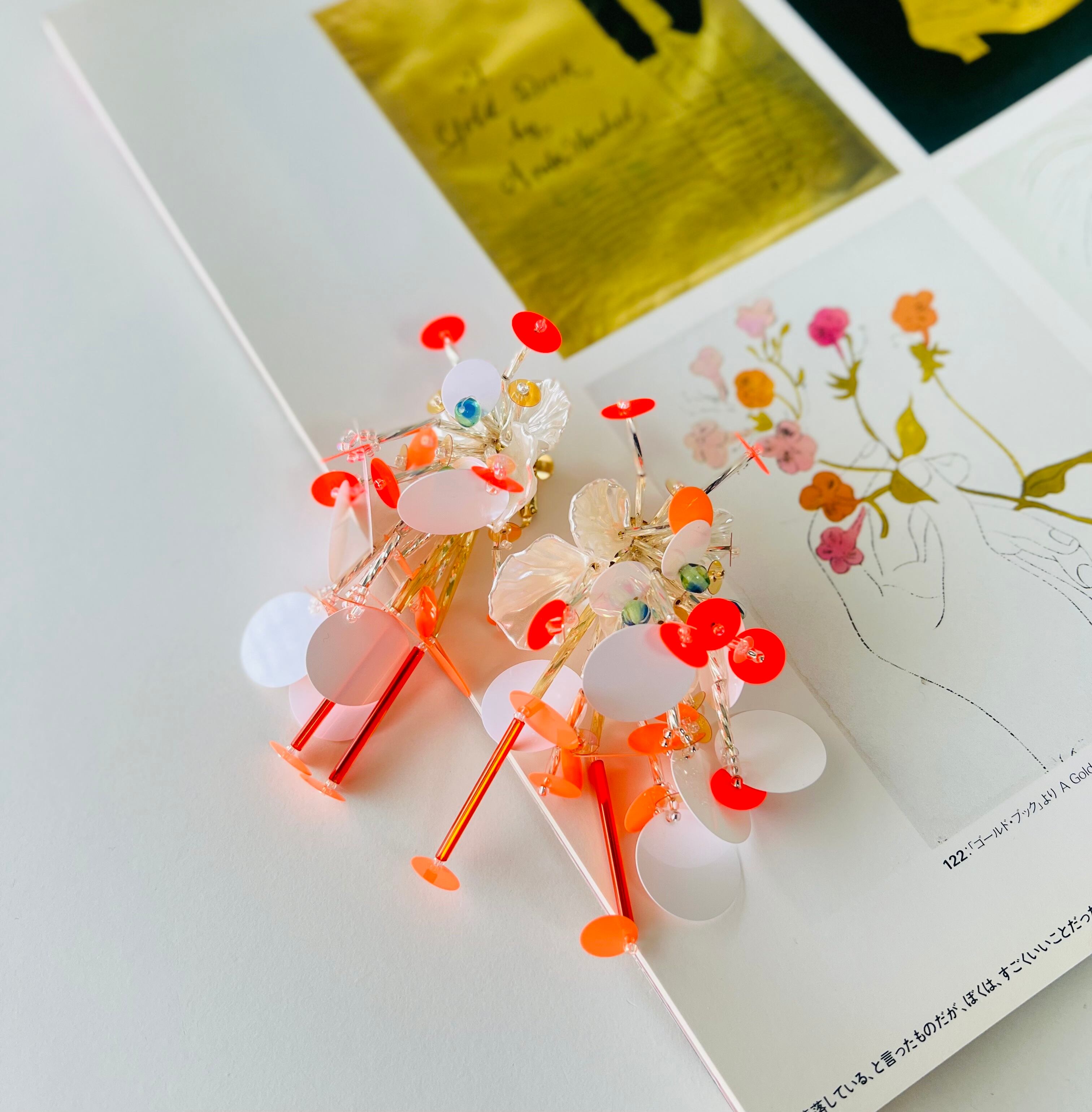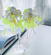 パールホワイトや乳白色の花びらを重ね花芯には様々な形のビーズやスワロフスキーを散りばめました。