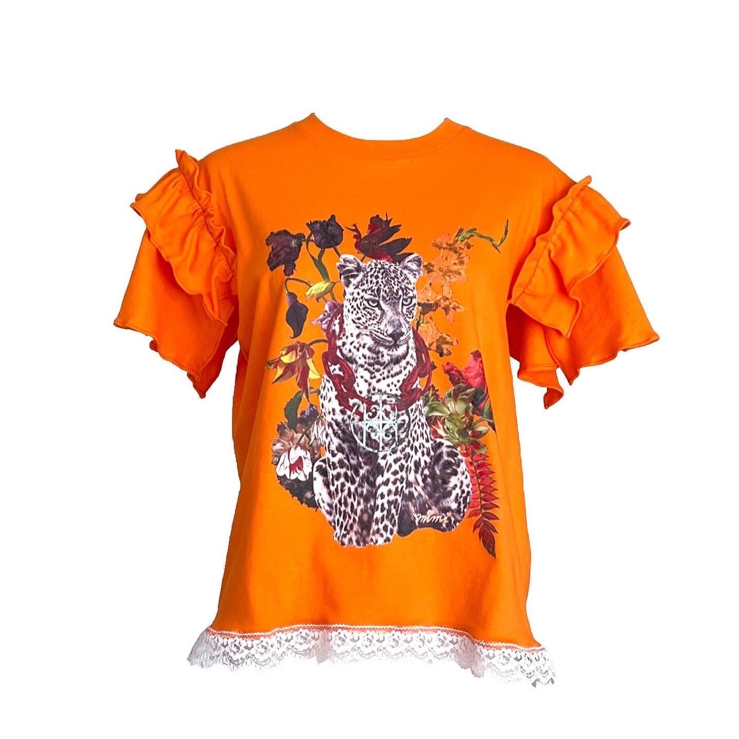 オリジナルレオバードTシャツが登場!手描きイラストによるレオパード柄が、オレンジのTシャツ地に映えます。さりげなくプリントされた広がるお花のモチーフも、カジュアルなコーデにちょっとしたアクセントを添えます。サイズM。身体にフィットするシルエットで、快適に過ごせます。