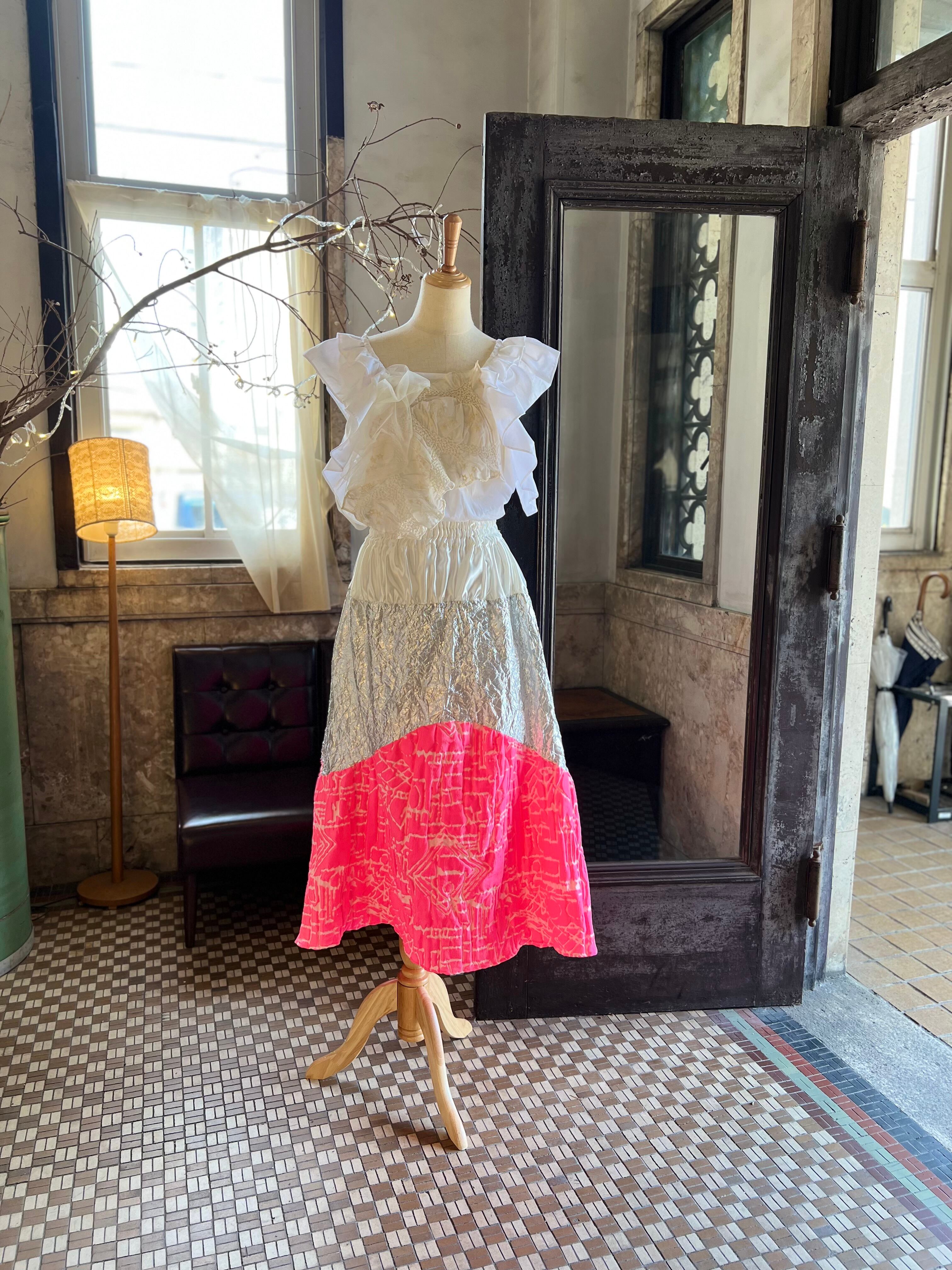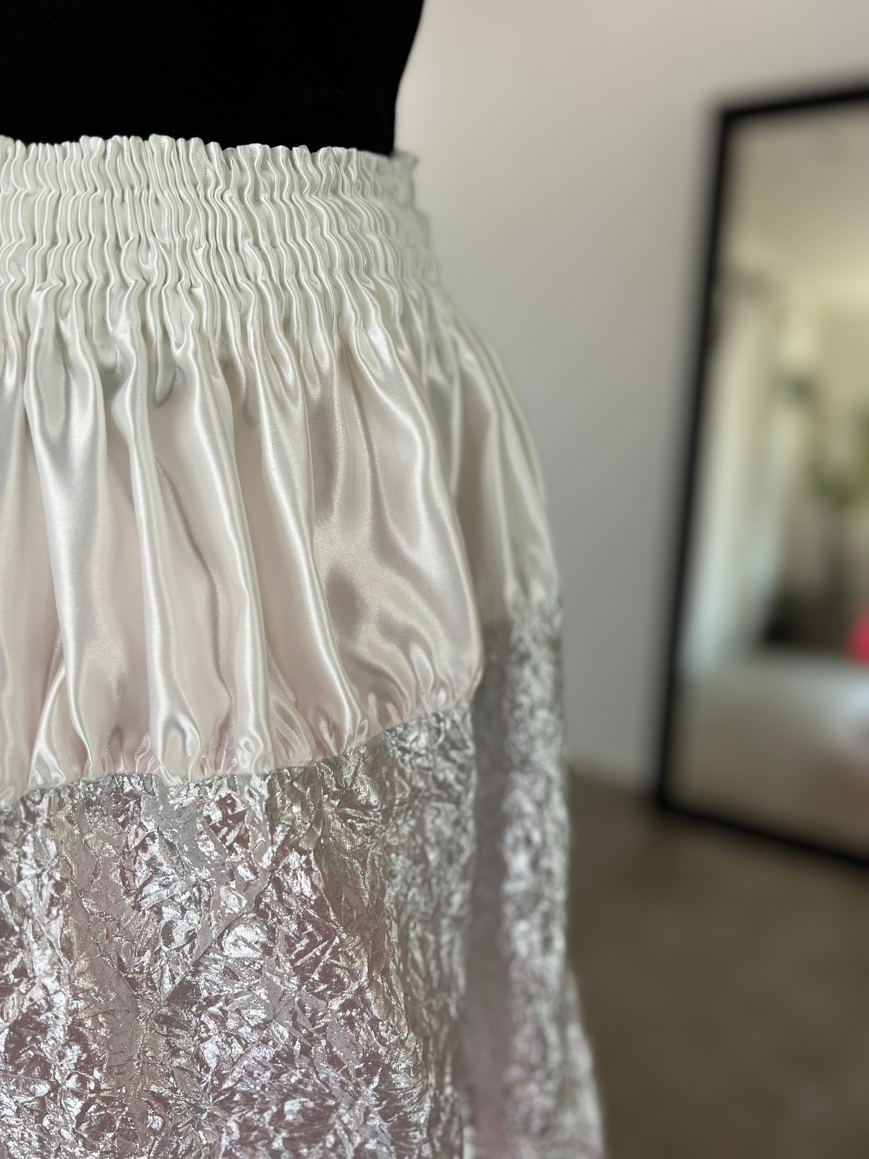シルバーと光沢のある白のカラーグラデのギャザースカートに仕上げ、上品で華やかな雰囲気を醸し出しています。ウエストは、太めのギャザーでスッとしたシルエットを演出。