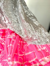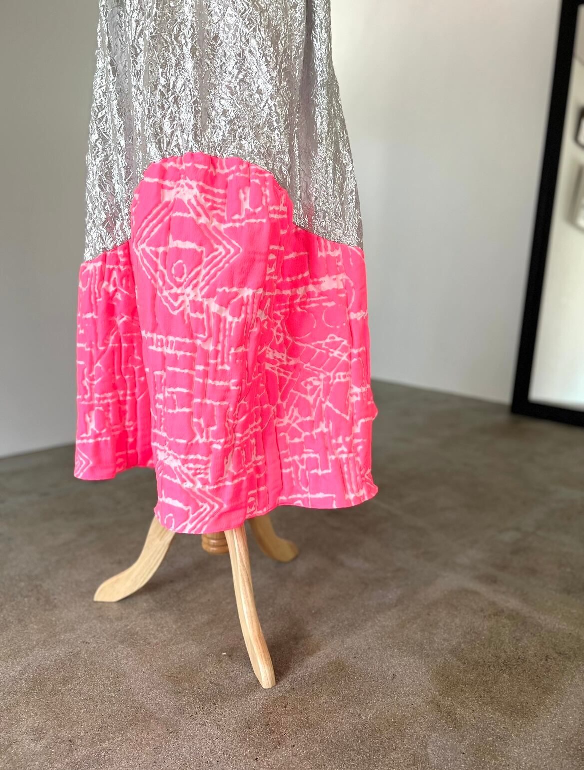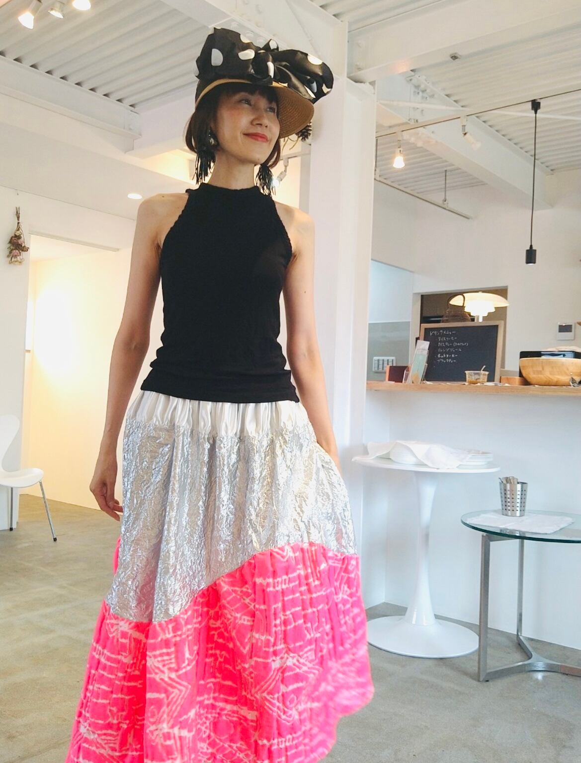 プリミティブなショッキングピンクのギャザースカートは、ビビットな色合いが印象的な一枚です。ピンクと白のデザインは、プリミティブアートのような面白いテキスタイルで、他にはない個性的な印象を与えます。