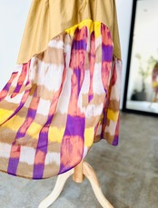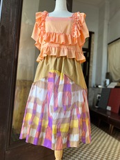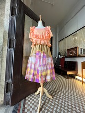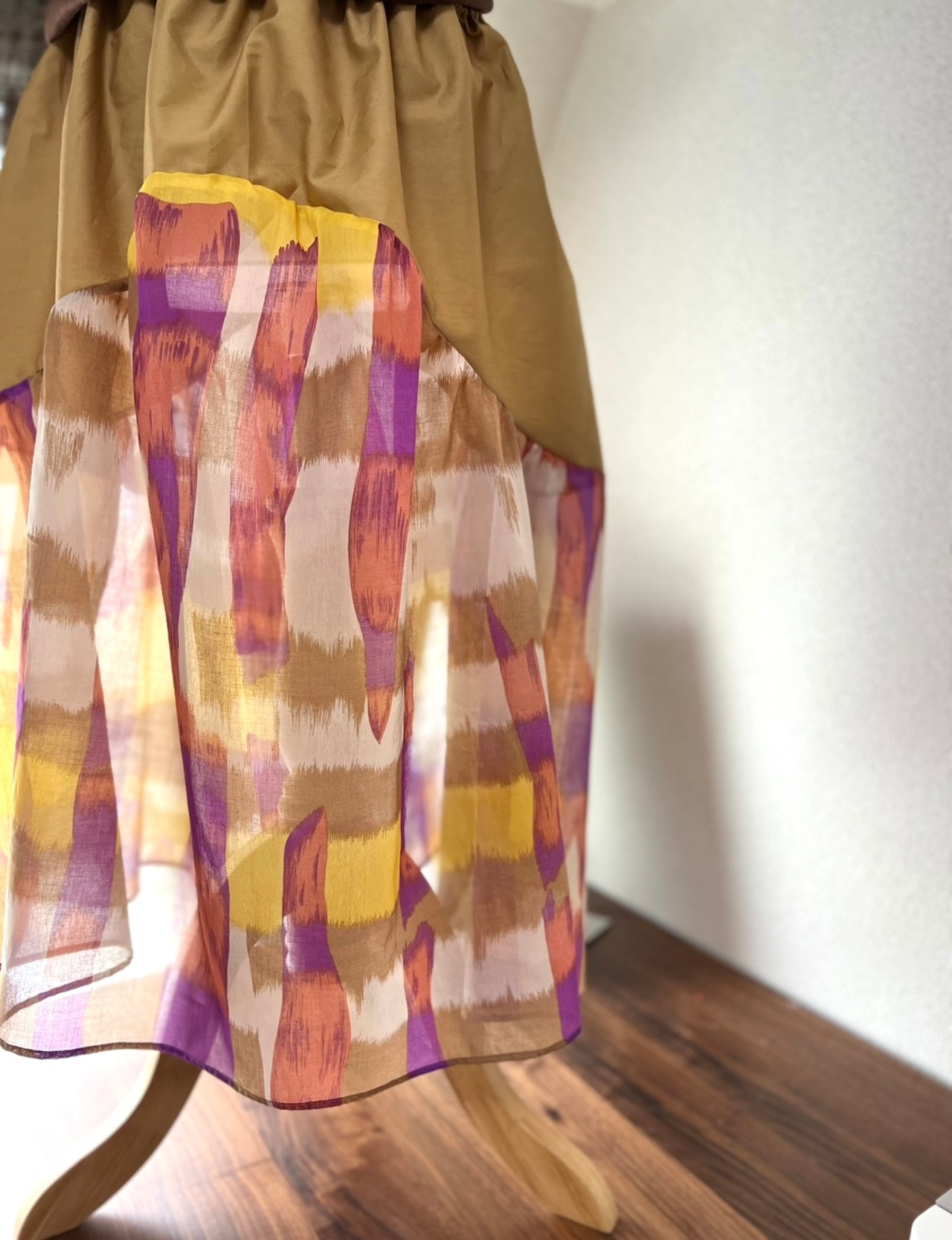 季節感ある配色と植物を思わせるようなデザインが可愛いギャザースカート。自然の美しさを身にまとい、心地よい風を感じながら歩くことができます。
