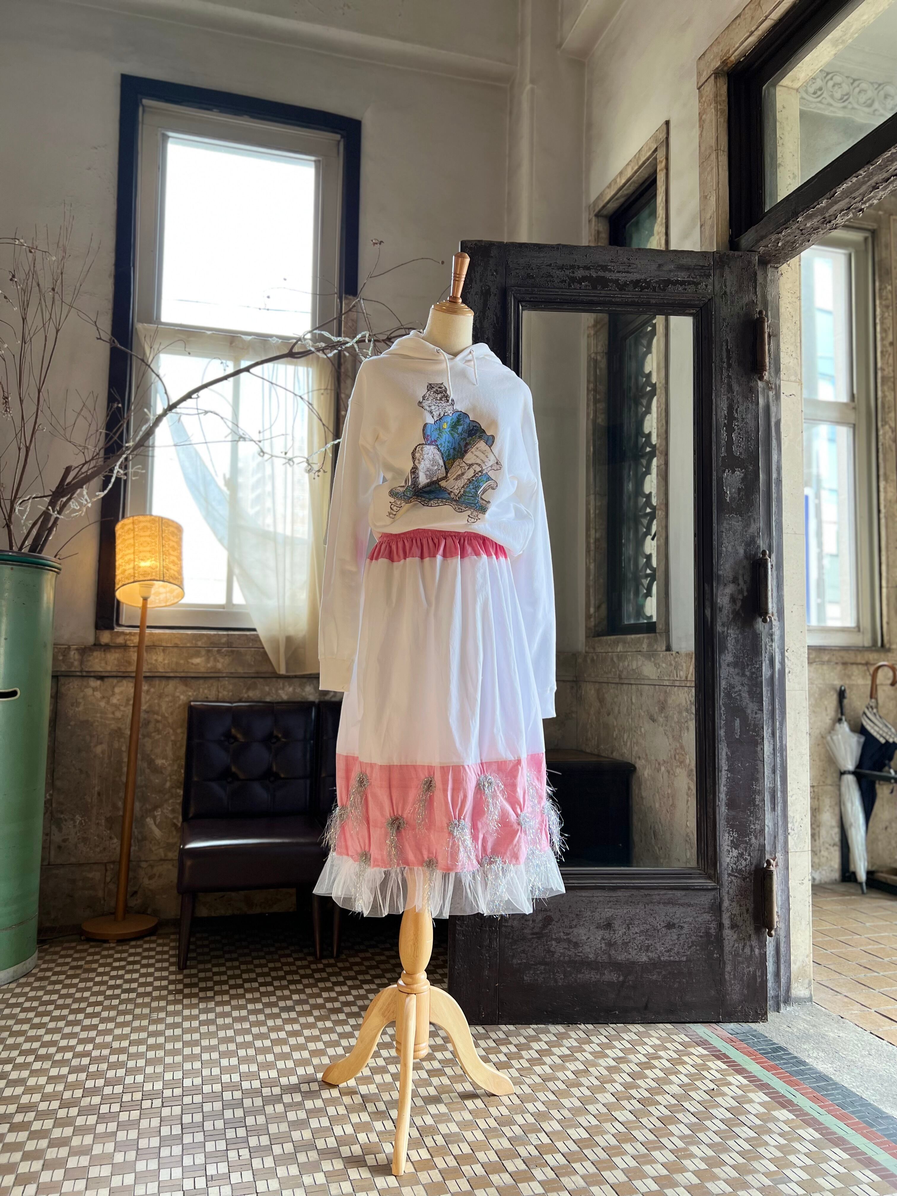播州織のピンクの生地を合わせストライプに仕上げました。軽やかな着心地で、歩くたびにスカートが揺れる様子はまるで海の中を泳いでいるようです。