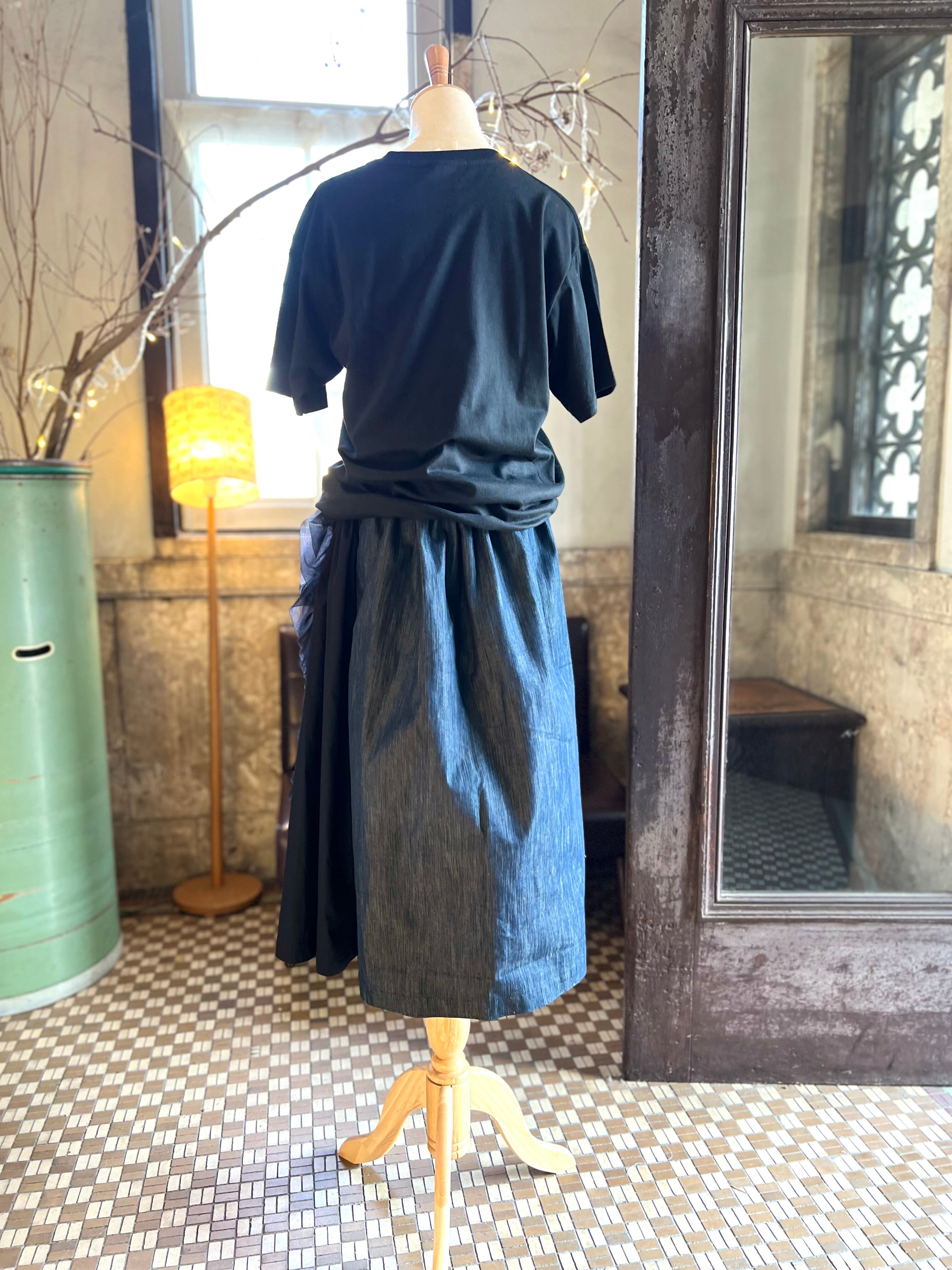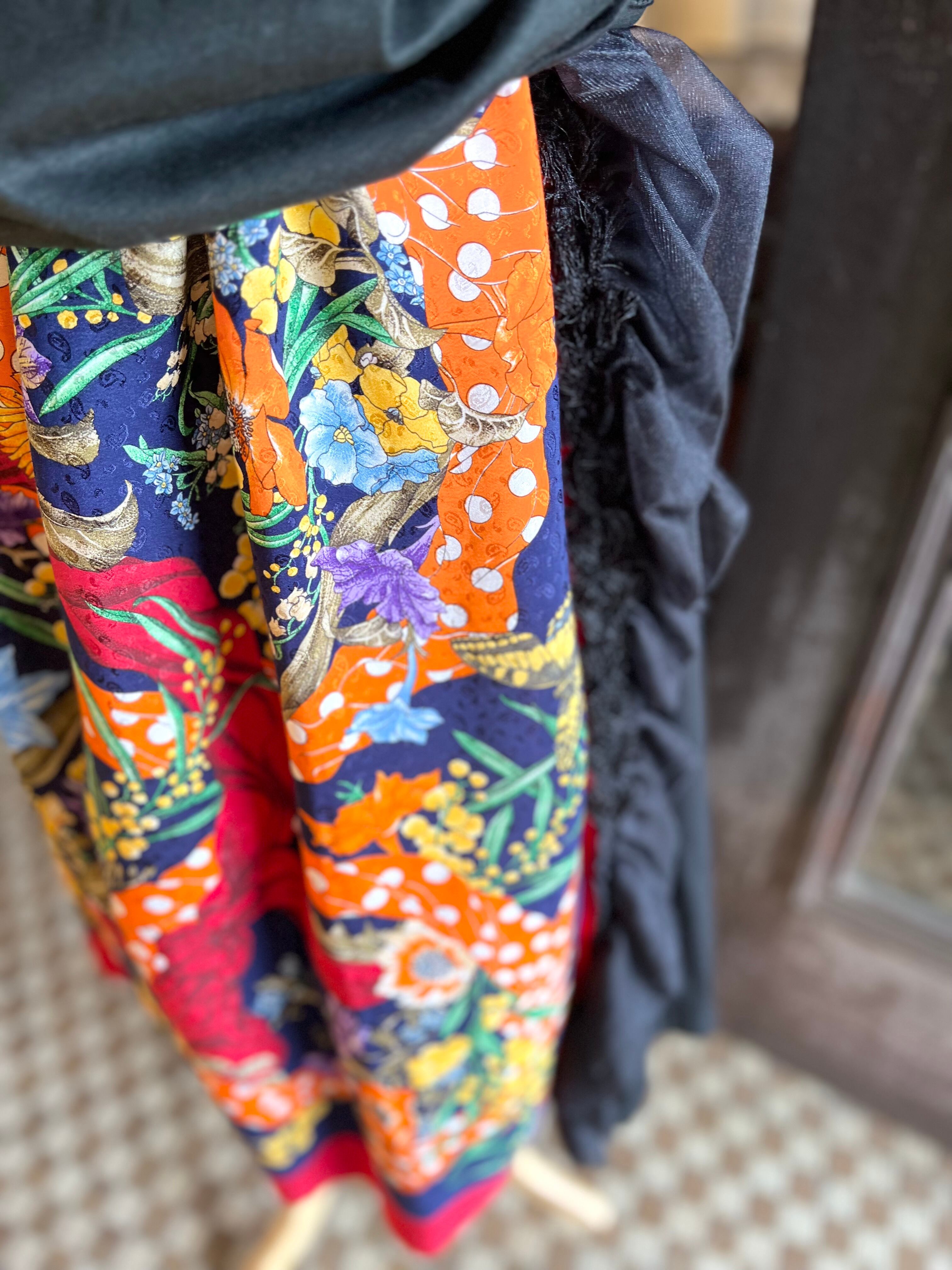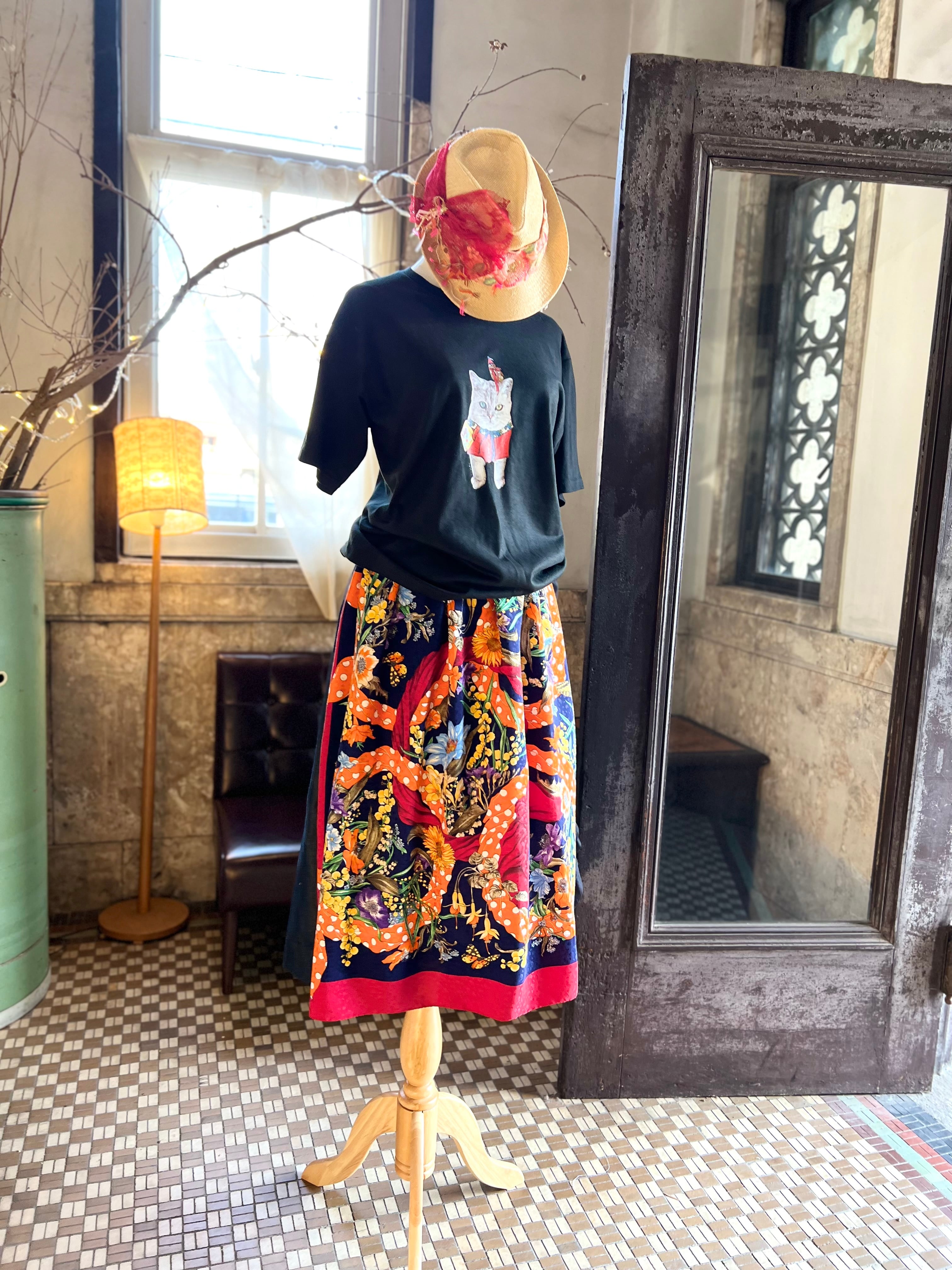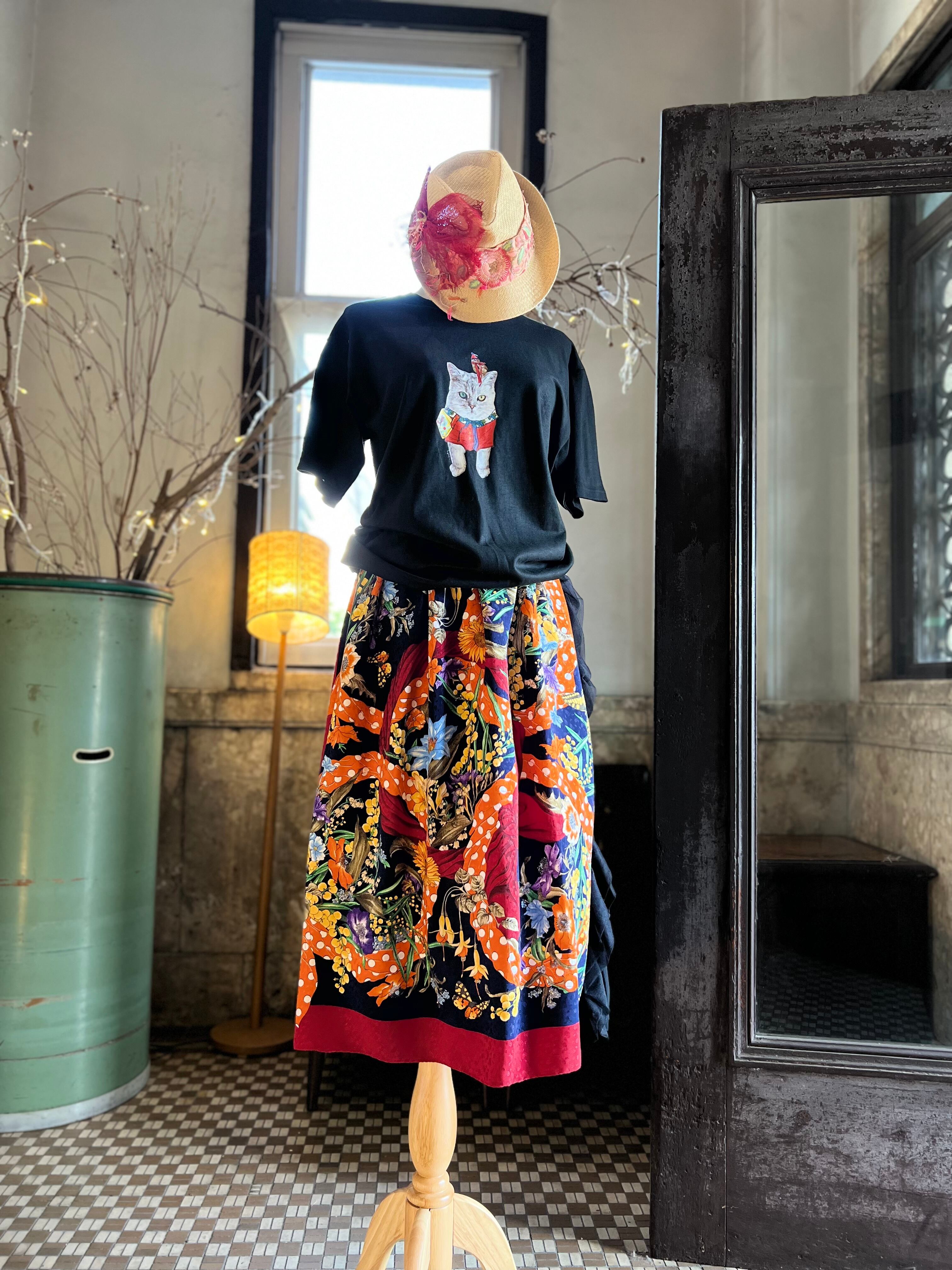 鮮やかなスカーフ柄が目を引く、スタイリッシュなギャザースカートです。赤を基調にしたスカーフ柄は、木々や花々が描かれており、自然を感じるデザインです。。デニムとのバイカラーで仕上げたことで、カジュアルさとエレガントさを兼ね備えた一枚となっています。