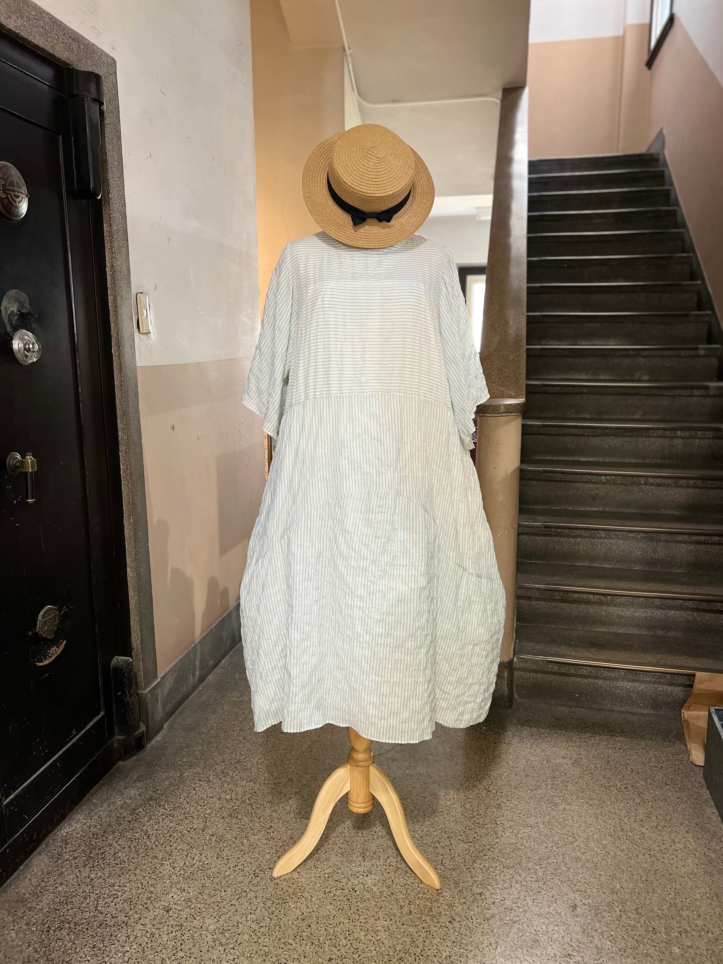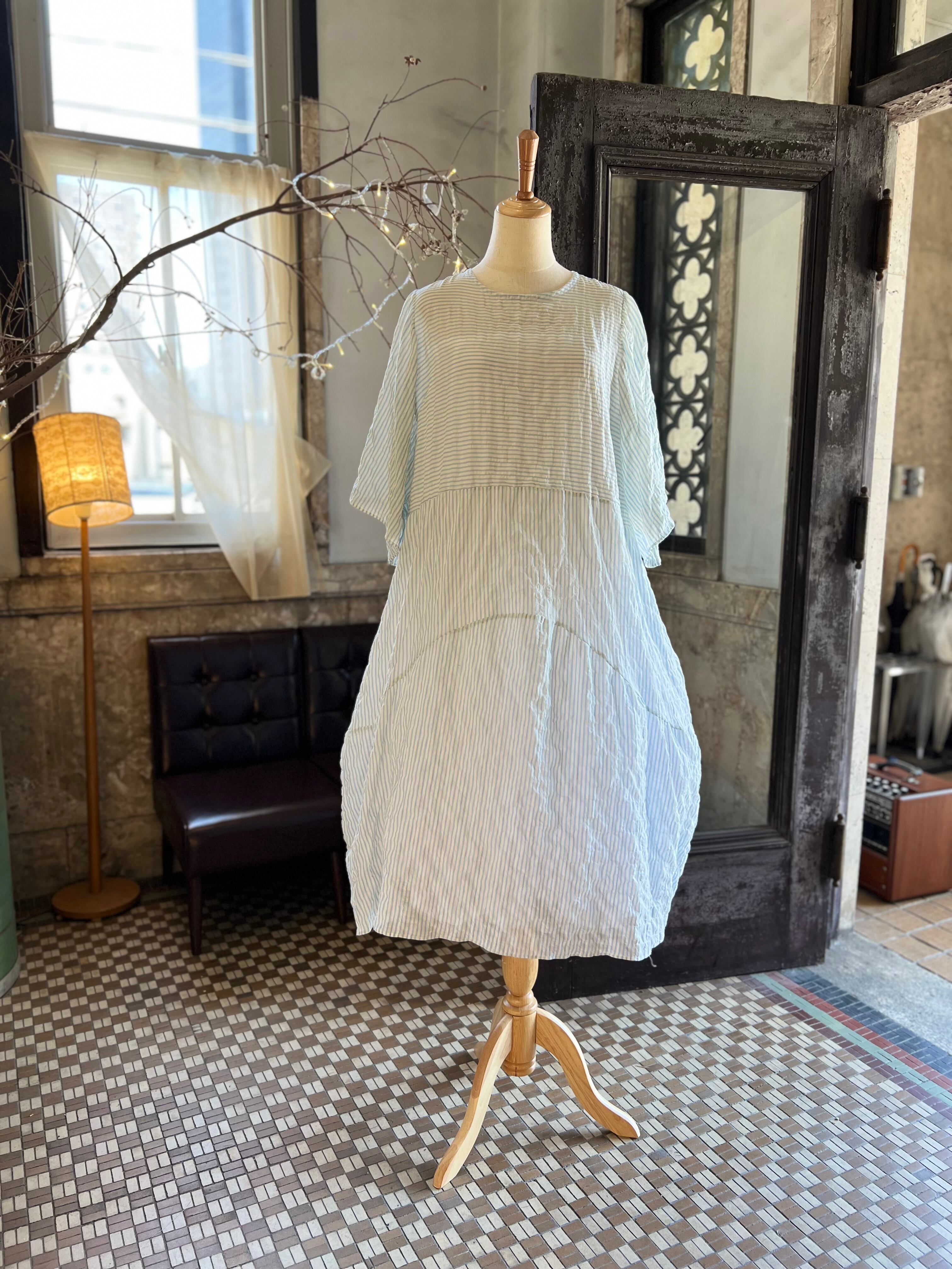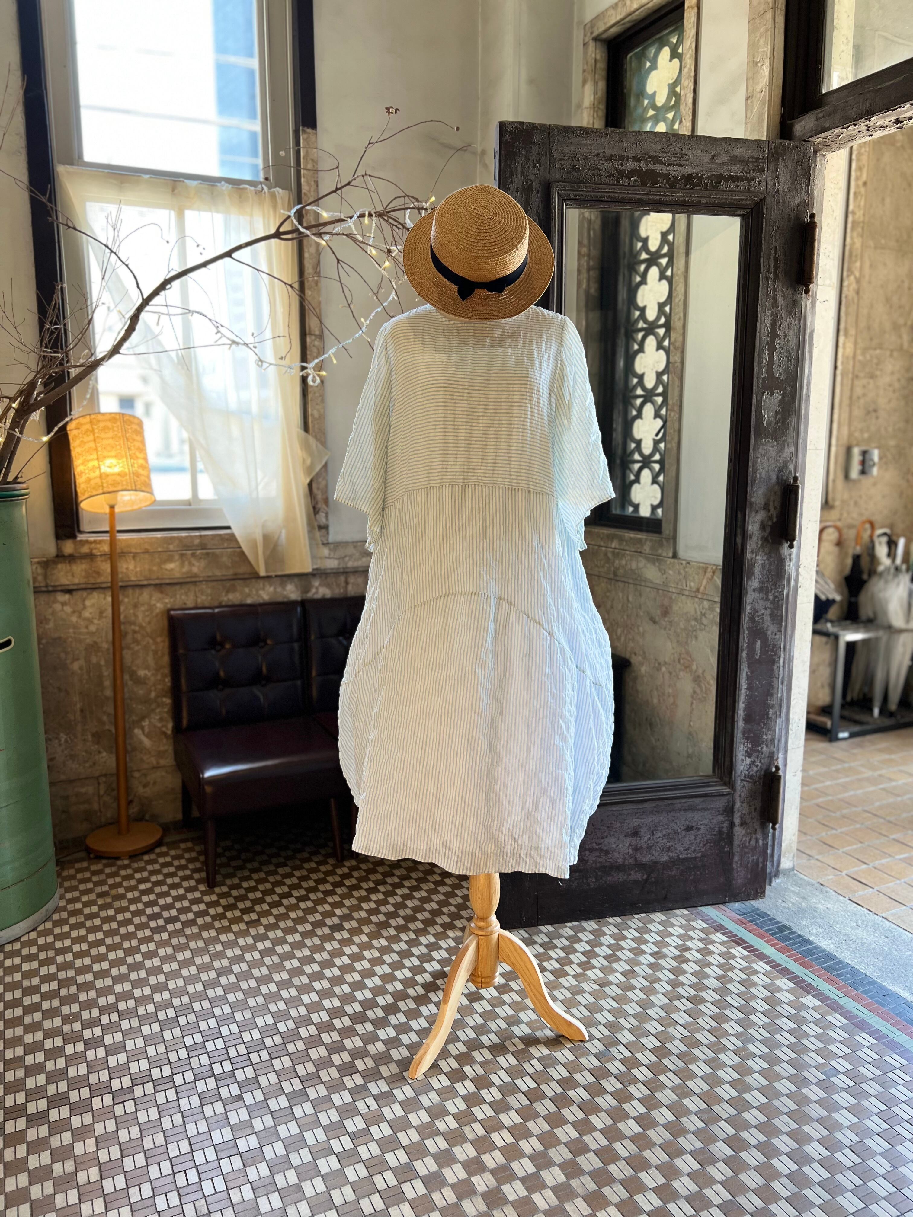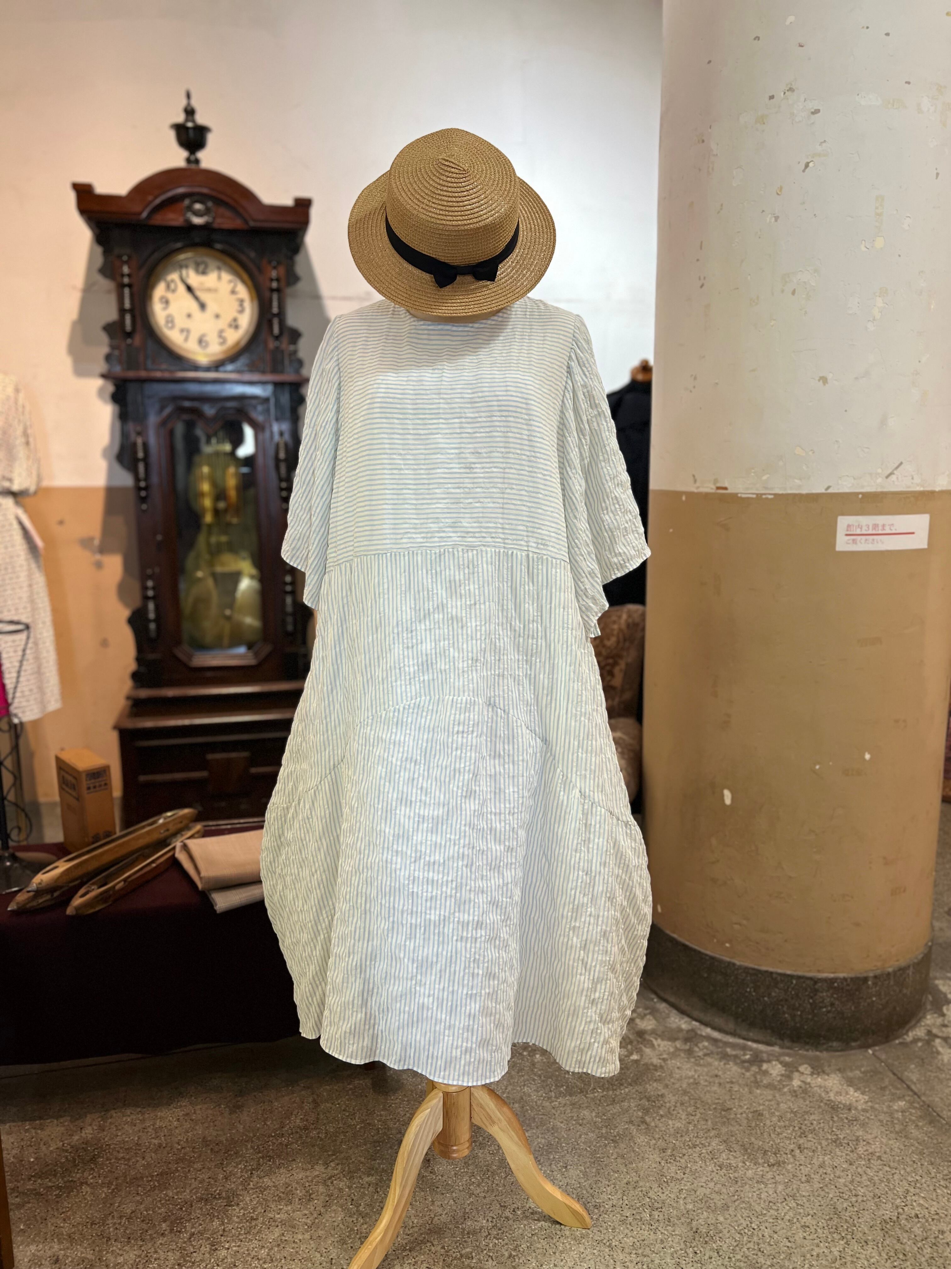 夏の訪れを感じさせる、淡い水色とナチュラルカラーのストライプワンピース。オールドスタイルなストライプデザインがどこか懐かしく感じさせ、着心地の良さも抜群です。洗礼されたフォルムでありながら、優しい雰囲気を醸し出す一枚です。
