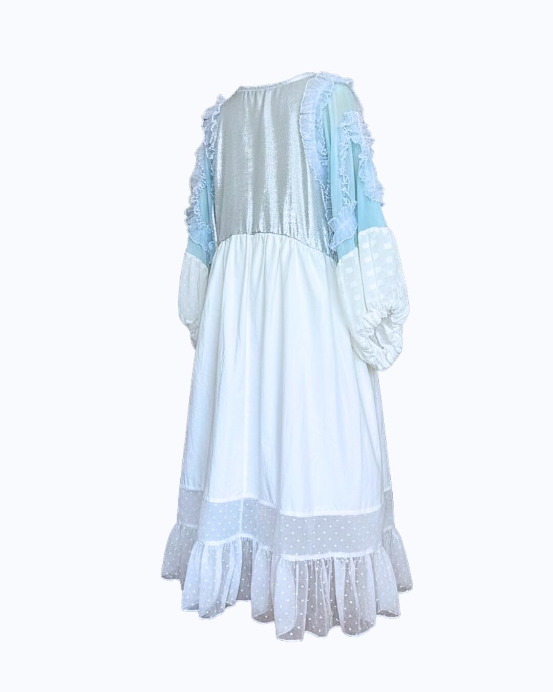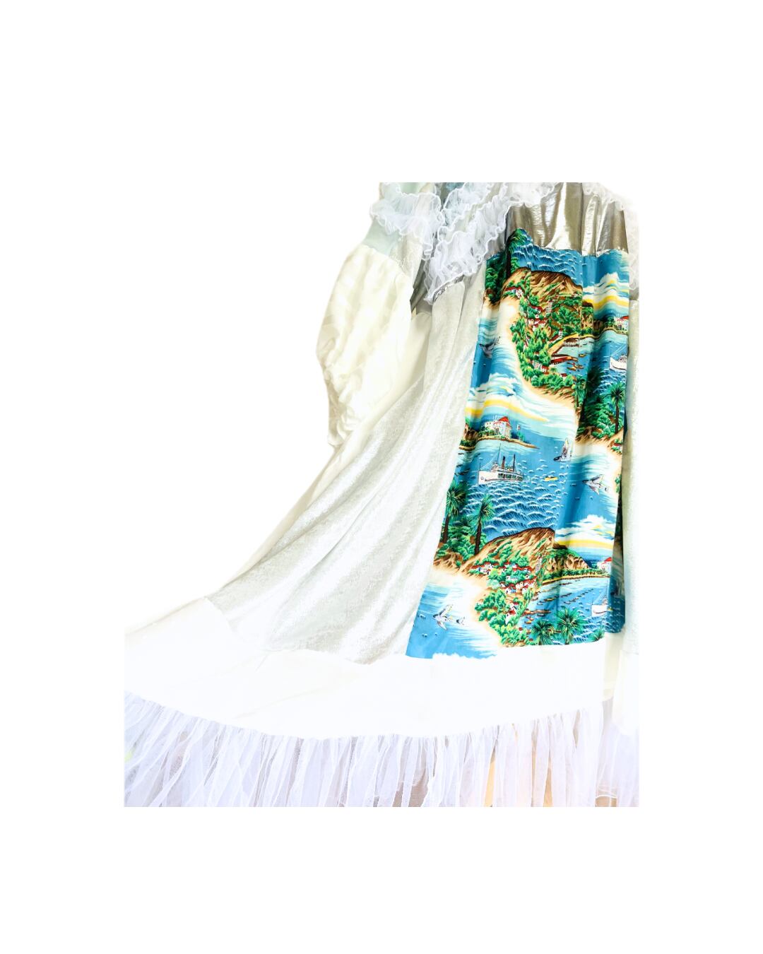 スカートのフロントには南の島。バックは爽やかにしろでお造りました。お袖はミントカラー、白のストライプとドットと左右で生地を変えました。ふりふりっとホワイト&ブルーで爽やかに仕上げました。ポケット両サイドに一つづつ。