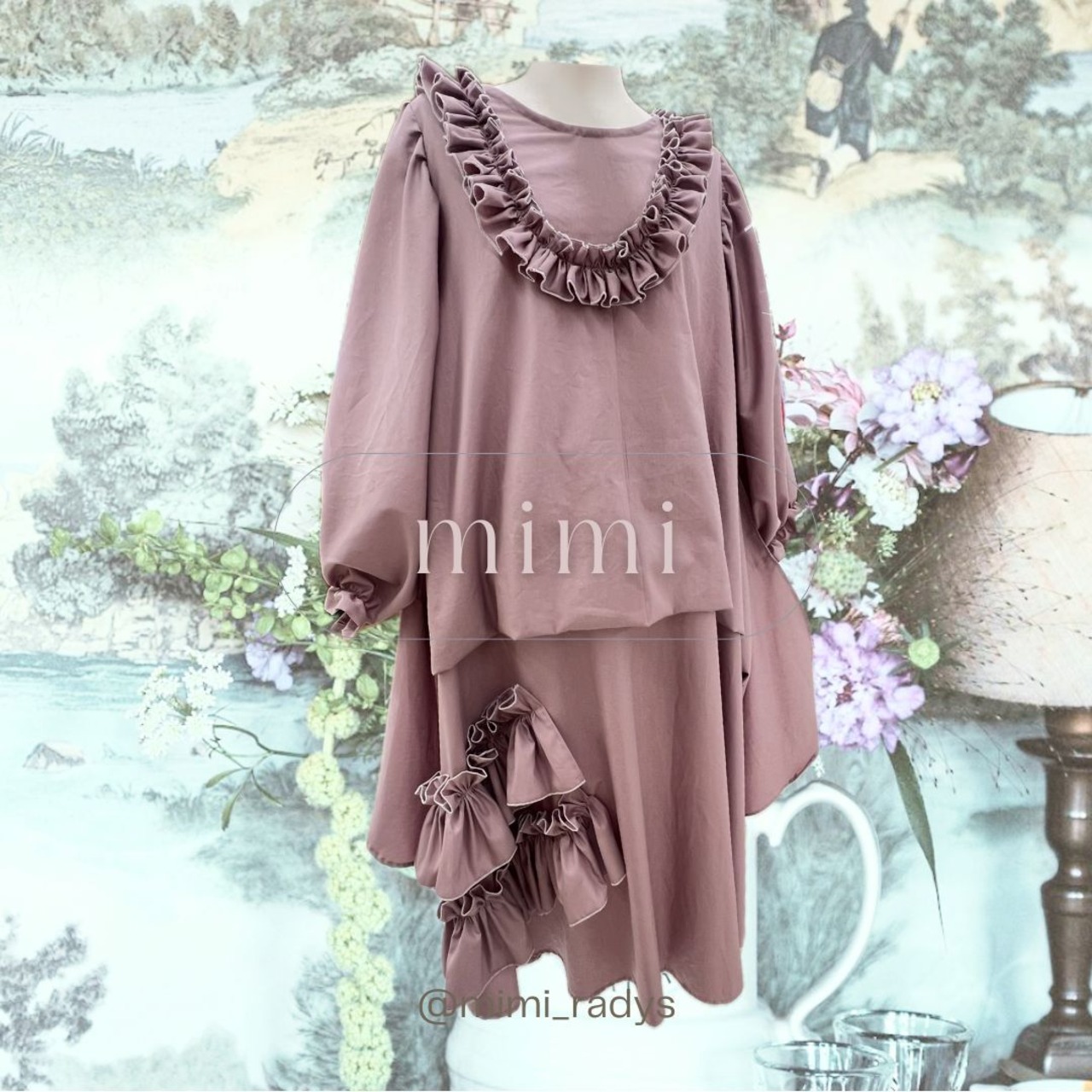 グレイッシュがクラッシックな可愛いピンクのワンピ。ポイントに少しフリルを付けて仕上げました。素材はコットン100%