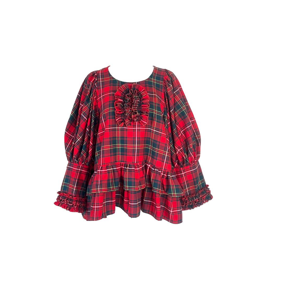 鮮やかな赤のタータンチェックは、一目で印象的なスタイルを演出。どんなボトムスにも合わせやすく、特別な日にもカジュアルにも活躍する一着です。コットンのネル素材でとても暖かく着心地も軽やかで、これからの季節にぴったり。フリルは動きやすさを考慮したデザインで、リラックス感があります。